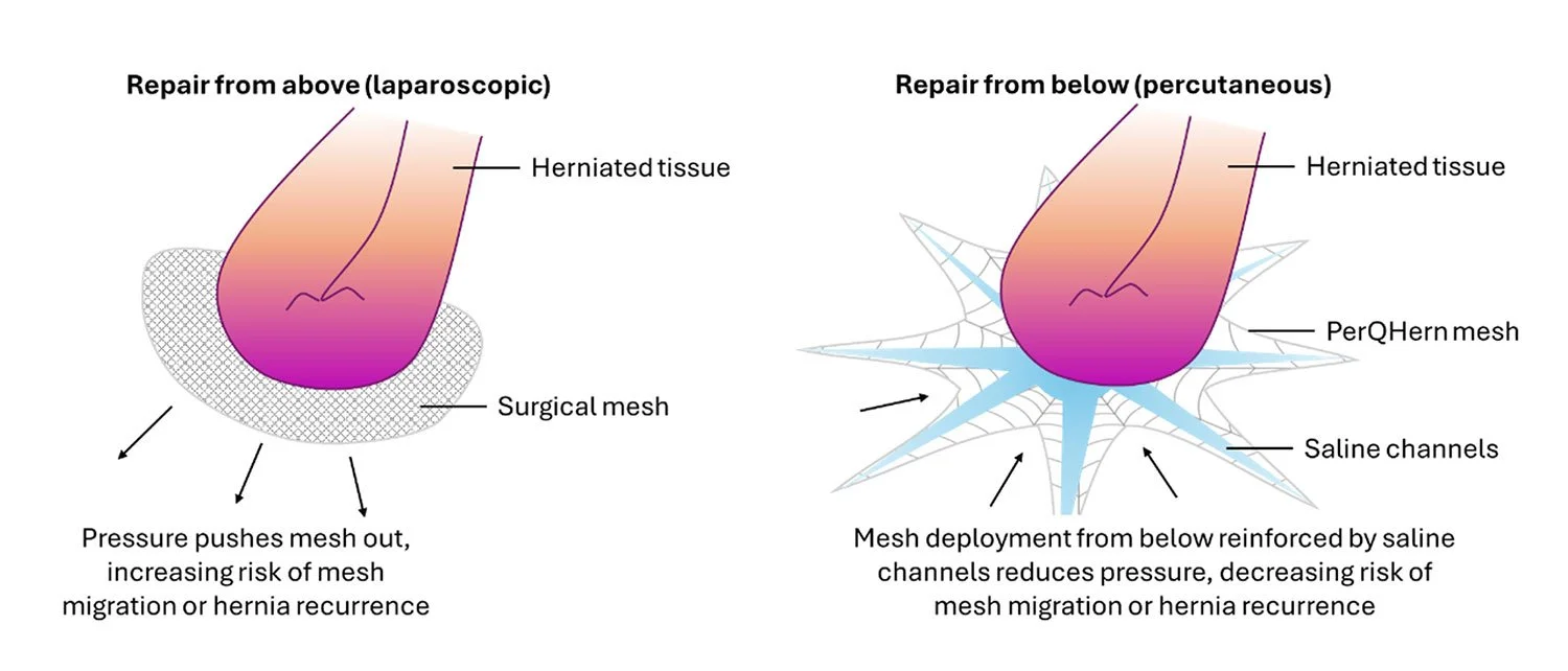 PerQHern is the world’s first percutaneous inguinal hernia repair system. As the first of its kind, it is the only method of inguinal hernia repair that meets the gold standard for this type of treatment: