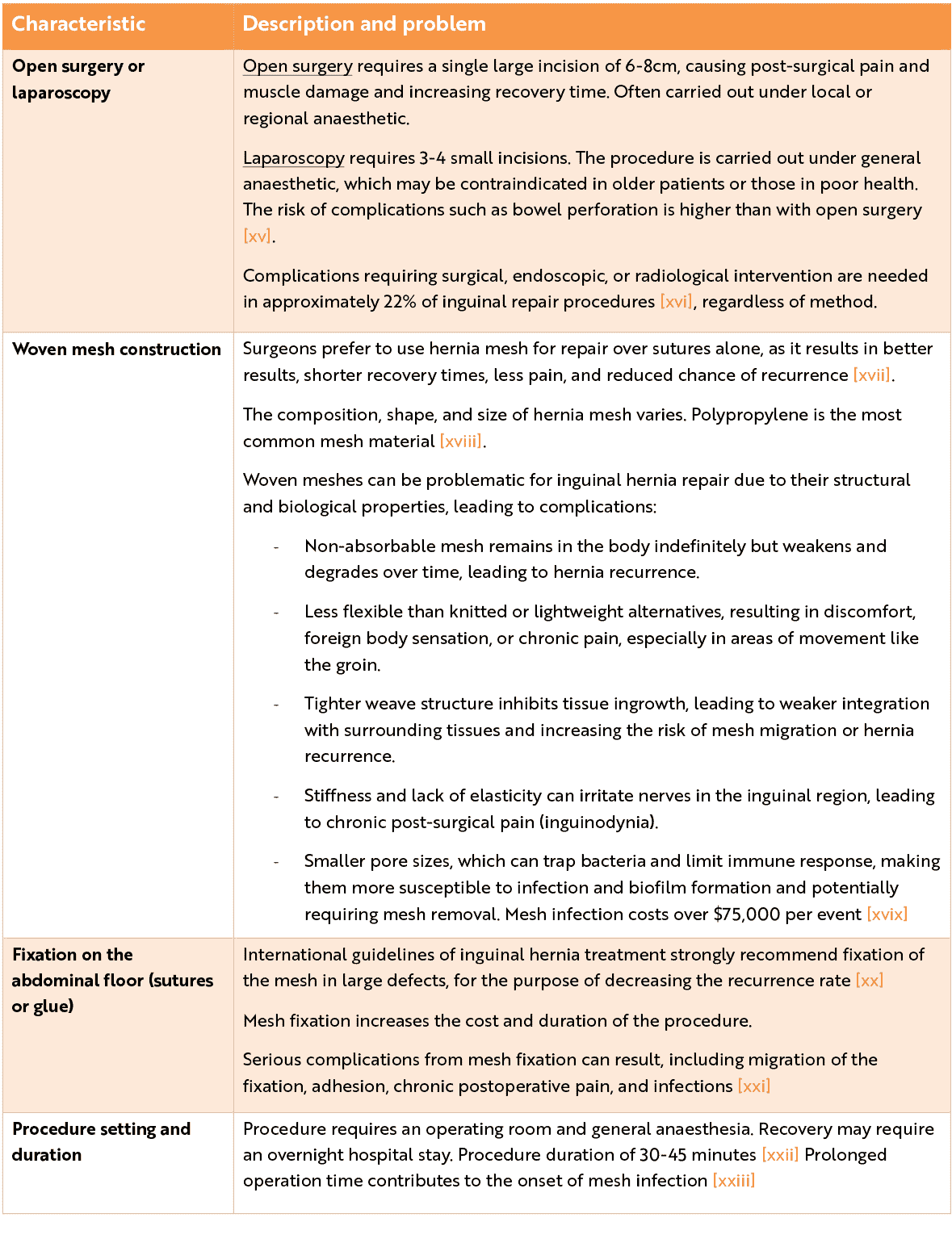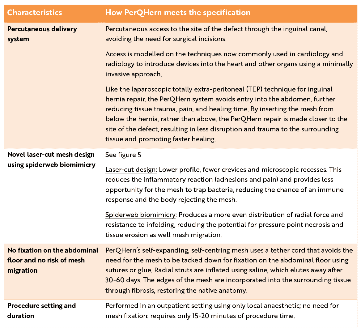 A truly gold standard medical device for inguinal hernia repair would (i) use a percutaneous delivery system to avoid the need for surgical incisions with (ii) a novel mesh design that does not weaken over time and reduces the risk of infection, chronic pain, and hernia recurrence and (iii) avoids the need for fixation on the abdominal floor without risk of migration, (iv) enabling the procedure to be performed in an outpatient setting without general anaesthesia in 20 minutes or less.