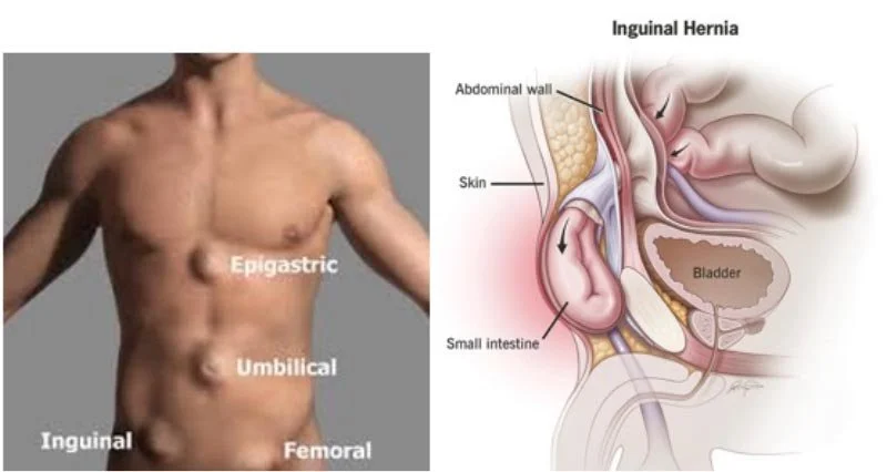Figure 2. (Left) Common types of hernia. (Right) Inguinal hernia.